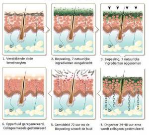 Door zijn aard en samenstelling veroorzaakt BIOPEELING wanneer het als kruidenmasker wordt in gemasseerd , een verwijdering van dode huidcellen. Daarbij stimuleren de microkristallen van BIOPEELING de dieper gelegen huidlagen, wat de originaliteit van het product uitmaakt. Een nieuwe gave huid wordt bewerkstelligd door de “micronaaldjes” in de levende keratinocyten, door een versnelde wisseling van de huid. Naast de eliminatie van oneffenheden (fijne rimpels, onregelmatige pigmentatie, comedonen) ontstaat een natuurlijk herstel van de opperhuid (epidermis).